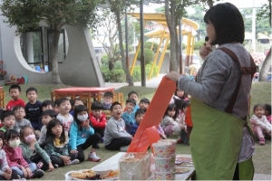 主題延伸課程~我的創意臉譜,活動從〝吐司吉胖〞的故事開始,「吉胖是個吐司麵包,它的身體不小心烤焦了一個洞,因為這樣,吉胖身旁的點心朋友一個個被買走,但自己卻孤拎拎的擺放在麵包櫃上。最後麵包店老闆幫吉胖想了好辦法,他將水果、巧克力、蕃茄…食材擺在吉胖的身上,也遮住它那破了洞的地方,吉胖頓時煥然一新,才剛擺回架上,馬上被買走了!」孩子們專心聽著故事,一直說自己也要做一個最棒、最特別的吐司臉譜喔。