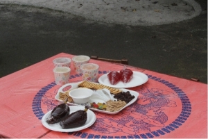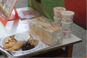 今天的食材,有吐司、小黃瓜、橘子、葡萄乾、玉米粒、餅乾…等等,種類豐富,同時也告訴孩子要惜福不浪費任何食材。