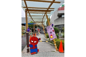 一早孩子到學校,一下車就看到大大蜘蛛網出現在迴廊,喔~~他的眼睛張大了,接著發現