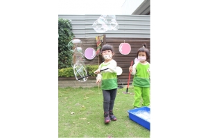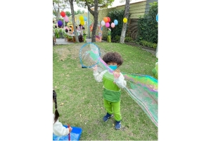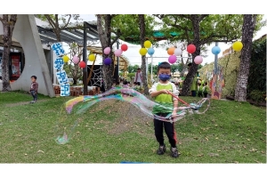人,拿著自製的泡泡器具,吹出一個又一個的泡泡,真幸福的畫面。