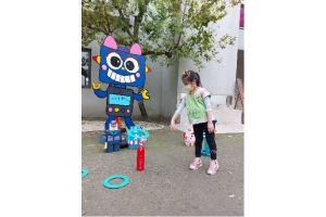 套圈圈」關卡遊戲,孩子拿著圈圈往前一丟,套住機器人,用紙箱組裝出一個專屬於自己的機器