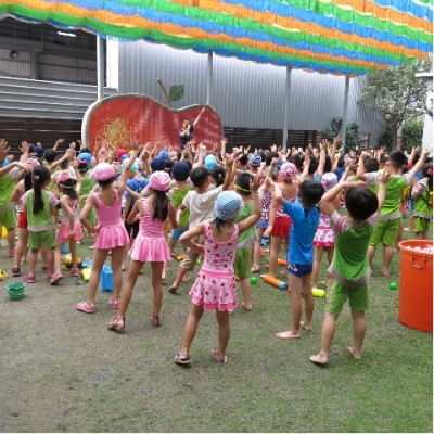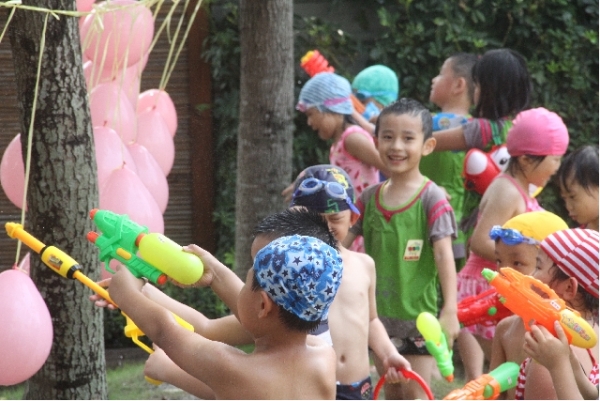 牛牛老師介紹了遊戲規則,帶領孩子熱身活動後,倒數3.2.1開始囉~使用水槍