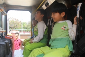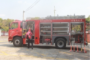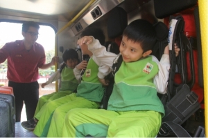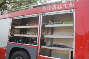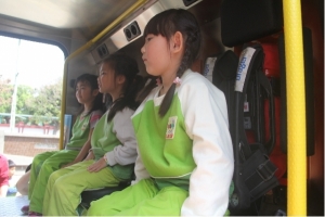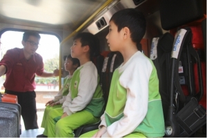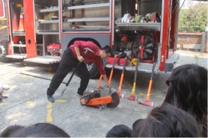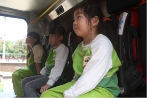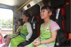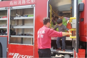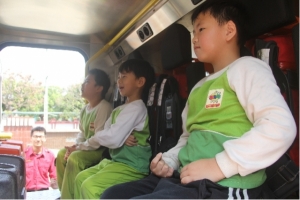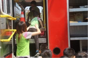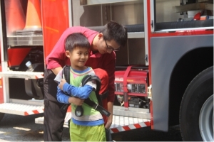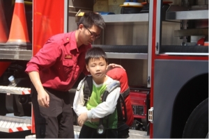 最後,消防叔叔介紹消防車裡的工具,說明如何使用,同時孩子也完成夢想-坐上消防車,