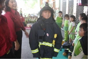 雖然衣服頭盔很重,但寶貝覺得能穿上消防阿姨的工作服真開心,