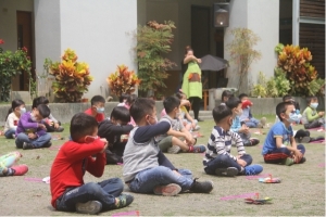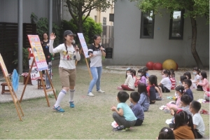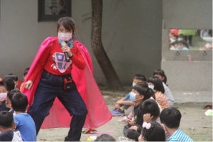 「口罩小衛兵」故事劇演出,寶貝們都很專心聆聽,故事中的口罩超人也來到現場,