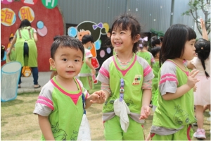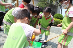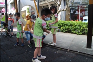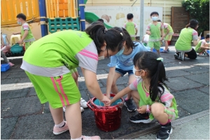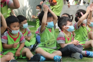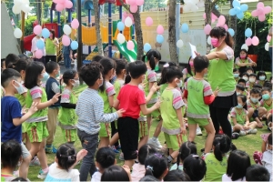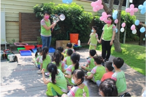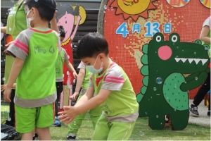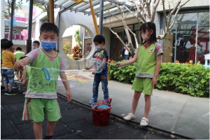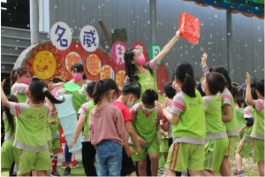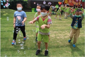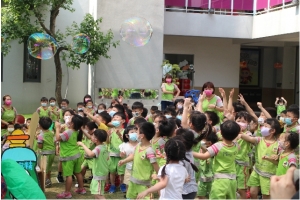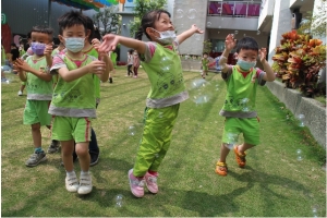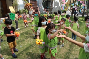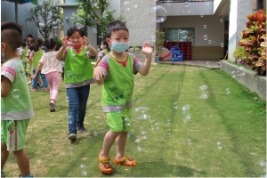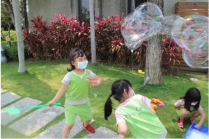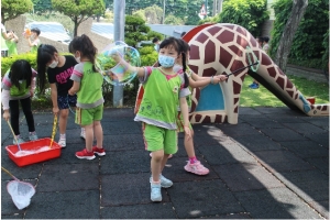 一起來吹泡泡囉!老師先跟孩子說明注意事項,不可以對著臉吹、不要奔跑注意安全……等等,