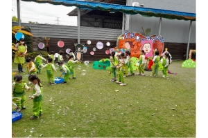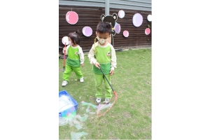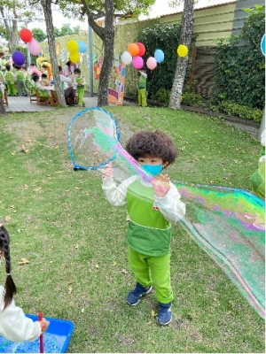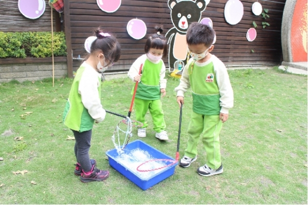 人,拿著自製的泡泡器具,吹出一個又一個的泡泡,真幸福的畫面。