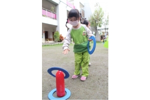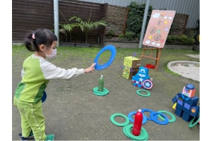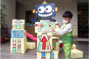 套圈圈」關卡遊戲,孩子拿著圈圈往前一丟,套住機器人,用紙箱組裝出一個專屬於自己的機器