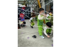 戲,孩子彎著腰、閃躲著紅外線蜘蛛網,拉著繩子打開雙臂,咻~~爬樹高手一下子就爬到樹上